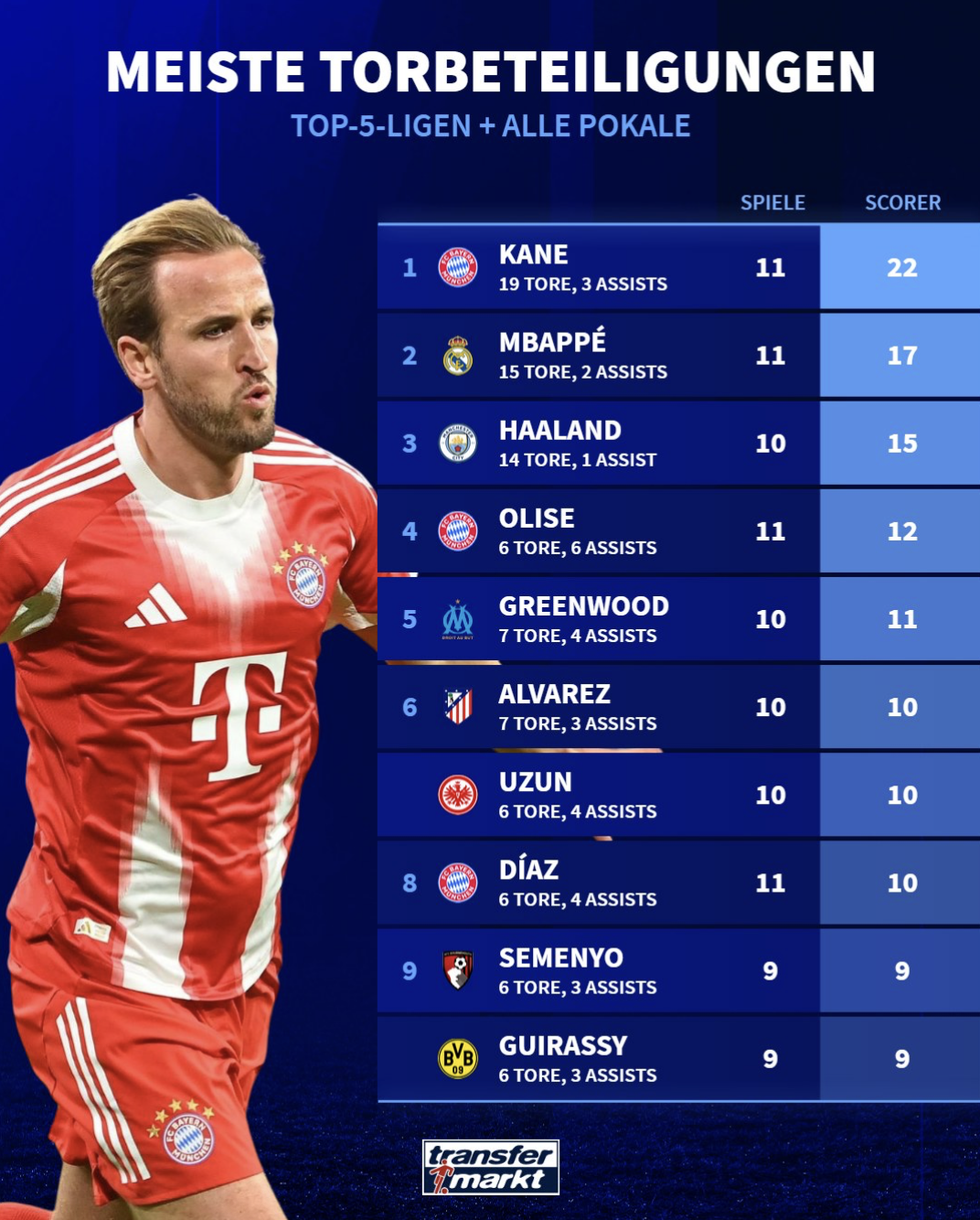 本季俱乐部各项赛事参与进球榜:凯恩11场22球高居榜首